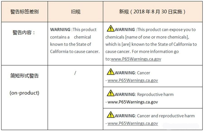各種情況都需要警告標(biāo)簽,包括環(huán)境暴露,消費者暴露及工作場所暴露。通過互聯(lián)網(wǎng)向加州客戶銷售的產(chǎn)品也需要警告。