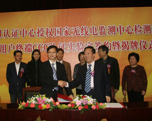 與會(huì)領(lǐng)導(dǎo)在簽約儀式上發(fā)表了熱情洋溢的講話。中國質(zhì)量認(rèn)證中心副主任陳偉、SRTC主任宋起柱分別代表雙方進(jìn)行簽約。中國質(zhì)量認(rèn)證中心主任王克嬌、國家無線電監(jiān)測(cè)中心主任劉巖,共同為“CQC委托簽約實(shí)驗(yàn)室”揭牌。